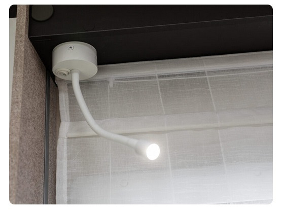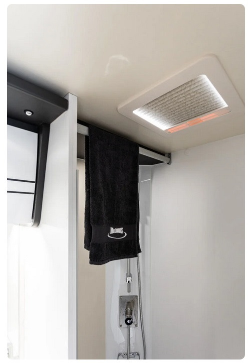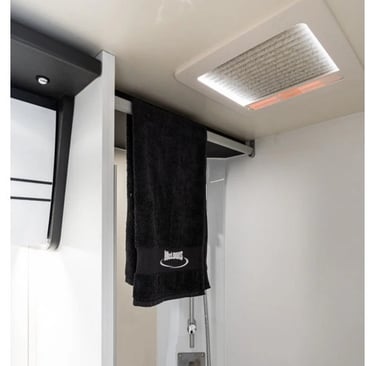 În interiorul zonei de dormit, spațiile multifuncționale se adaptează fiecărei nevoi, oferind două soluții într-o singură configurație: paturi duble suprapuse sau pat transversal superior. Patul superior este echipat cu un mecanism electric de ridicare care, cu un buton practic, permite ridicarea și coborârea patului cu 20 cm pentru o gestionare optimă a spațiului. În poziția ridicată, patul superior se află la 1,50 m deasupra solului și este accesibil printr-o scară detașabilă. De asemenea, este disponibilă o plasă de siguranță pentru a asigura siguranța în timpul somnului. Un panou situat sub patul superior poate fi detașat și folosit ca ușă de separare între unitatea celulară și dulapul din garaj, fixat cu magneți pentru o fixare stabilă și practică.