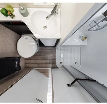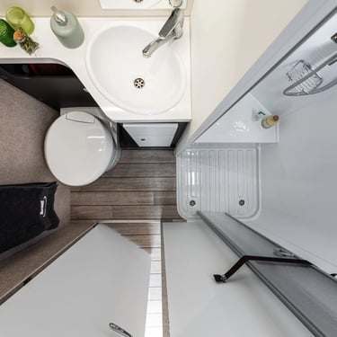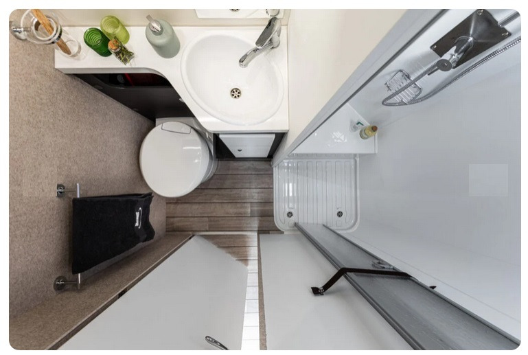 Zona băii este concepută pentru a oferi confort și comoditate. Dispune de hublouri de 28×28 pentru o bună ventilație, un duș integrat cu uși de separare și un suport de haine integrat. Lavoarul de colț de formă ovală este combinat cu un suport pentru periuța de dinți cu pahar din sticlă și suport cromat pentru o notă de eleganță. O oglindă cu spoturi, împreună cu un dulap suspendat și o ușă cu închidere prin apăsare, completează camera cu soluții de depozitare sigure și funcționale.