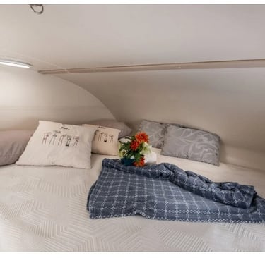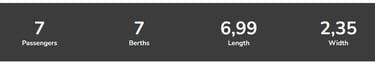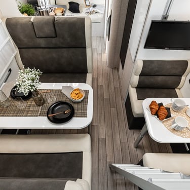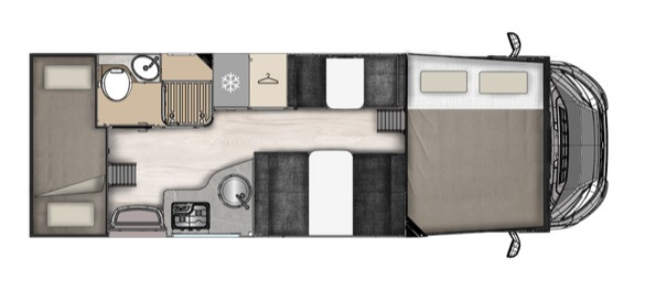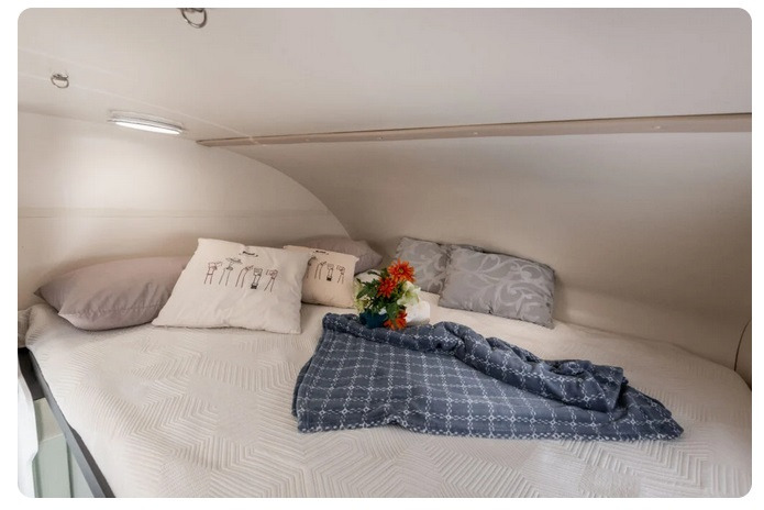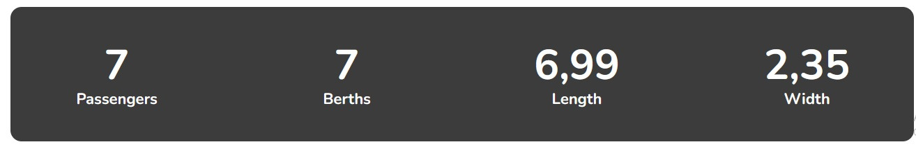 Cabină supraetajată sub 7 metri cu 7 locuri de dormit și o sufragerie dublă. Potrivită pentru familii. Cu paturi supraetajate în spate și toaletă cu duș integrat.