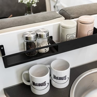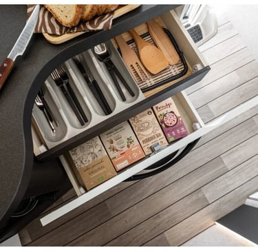 Bucătăria liniară dispune de un blat de lucru mare, o plită cu 2 arzătoare și o chiuvetă rotundă din oțel periat, pentru practicitate și stil. Cămara mare oferă tot spațiul necesar familiei, cu 2 corpuri de mobilier suspendate cu rafturi, un sertar cu închidere silențioasă și 3 uși, inclusiv o ușă verticală cu raft, pentru organizarea perfectă a vaselor și a alimentelor.