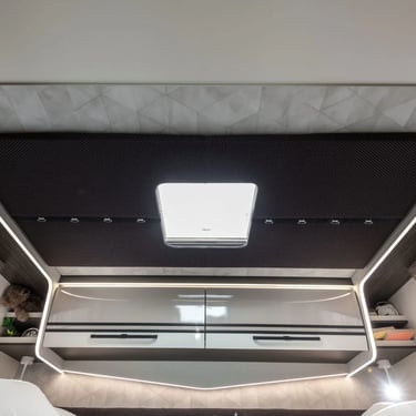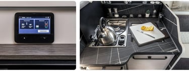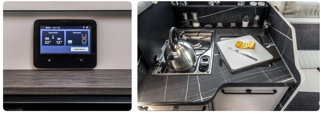 Zona de living combină spațiul, luminozitatea și funcționalitatea, creând un mediu primitor și versatil, ideal pentru momente de relaxare și convivialitate. Poate găzdui până la cinci persoane, asigurând confort și libertate de mișcare. Masa rotativă și glisantă la 360° oferă flexibilitate maximă pentru mese și socializare. Panoul de control iNet X vă permite să gestionați cu ușurință toate funcțiile de la bord. Ușa rigidă care separă zona de living de cea de dormit asigură intimitate și liniște.