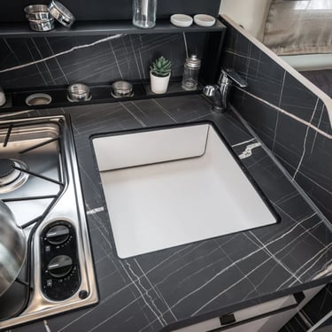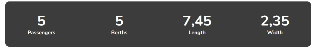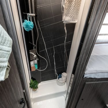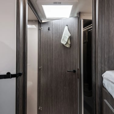 Baia este proiectată pentru a asigura confort maxim, funcționalitate și intimitate. Hublonul oferă lumină naturală și ventilație, în timp ce cabina de duș mare oferă caracter practic și ușurință în utilizare. Spațiul este completat de un dulap cu oglindă și un raft de depozitare pe toată lungimea, cu suport integrat pentru periuța de dinți, perfect pentru a păstra totul în ordine. Ușa băii poate fi folosită ca o despărțire între zonele de living și de dormit, asigurând intimitate și funcționalitate în orice moment.