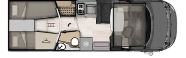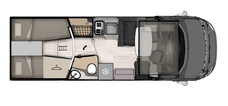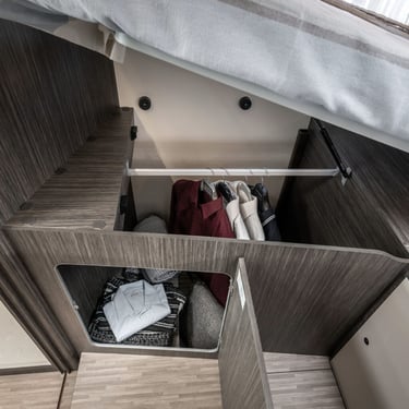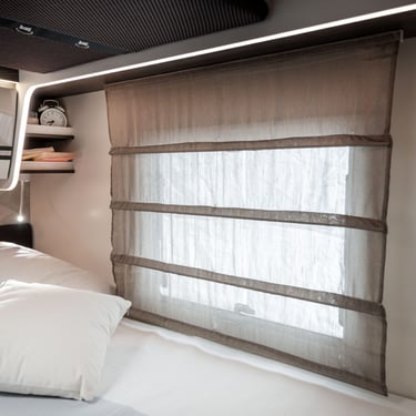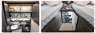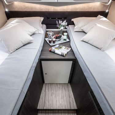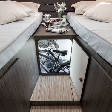 Zona de dormit oferă un mediu funcțional și confortabil, conceput pentru a optimiza spațiul și a asigura o relaxare maximă. Paturile twin, ambele lungi de 2 metri, asigură confort chiar și pentru persoanele mai înalte. Spațiul de depozitare de sub lamele rabatabile vă permite să depozitați obiecte voluminoase fără a sacrifica spațiul de locuit, în timp ce accesul convenabil la garaj face ca încărcarea și descărcarea să fie practice. Spațiul este completat de un dulap mare și corpuri suspendate cu rafturi și rafturi laterale duble, ideale pentru a păstra totul ordonat și la îndemână.