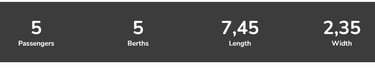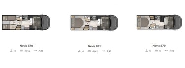 Autorulotă cu o lungime de 7,45 metri, cu paturi twin în spate și sufragerie cu masă centrală.