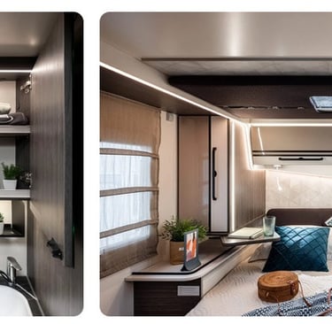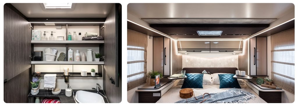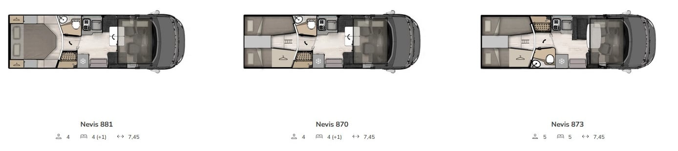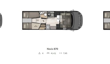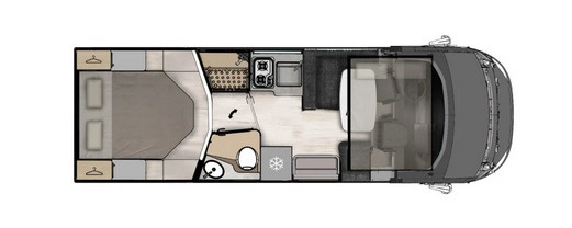 Zona de dormit oferă un mediu funcțional și confortabil, conceput pentru a optimiza spațiul și a asigura o relaxare maximă. Paturile twin, ambele lungi de 2 metri, asigură confort chiar și pentru persoanele mai înalte. Spațiul de depozitare de sub lamele rabatabile vă permite să depozitați obiecte voluminoase fără a sacrifica spațiul de locuit, în timp ce accesul convenabil la garaj face ca încărcarea și descărcarea să fie practice. Spațiul este completat de un dulap mare și corpuri suspendate cu rafturi și rafturi laterale duble, ideale pentru a păstra totul ordonat și la îndemână.