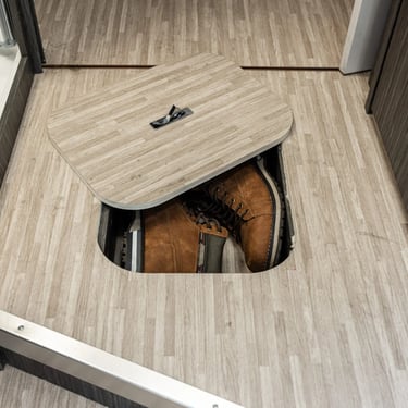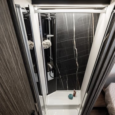 Baia este proiectată pentru a asigura confort maxim, funcționalitate și intimitate. Hublonul oferă lumină naturală și ventilație, în timp ce cabina de duș mare oferă caracter practic și ușurință în utilizare. Spațiul este completat de un dulap cu oglindă și un raft de depozitare pe toată lungimea, cu suport integrat pentru periuța de dinți, perfect pentru a păstra totul în ordine. Ușa băii poate fi folosită ca o despărțire între zonele de living și de dormit, asigurând intimitate și funcționalitate în orice moment.