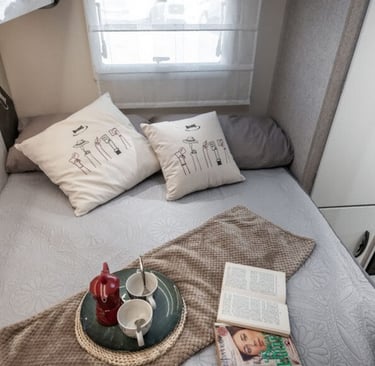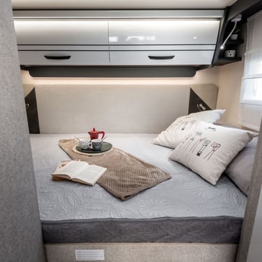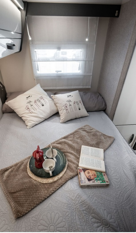 Patul transversal, cu spațiu de depozitare în treptele de acces, are un sistem electric de ridicare convenabil. Dulapul mare din spate vă permite să transportați tot ce aveți nevoie în timpul călătoriei. Camera este confortabilă și luminoasă datorită ferestrelor mari și hubloului din spate.