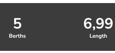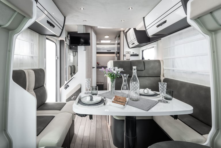 Profil redus cu pat rabatabil sub 7 metri, cu pat transversal în spate și dinette mare în formă de L cu canapea laterală.