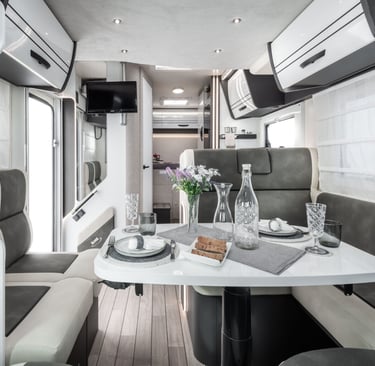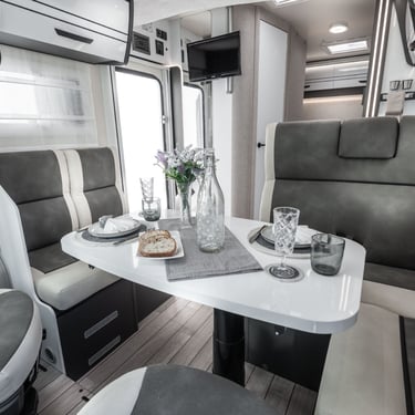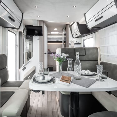 Un living spațios, luminos și confortabil, conceput pentru a găzdui până la 5 persoane. Dinetă mare oferă o zonă convivială perfectă pentru momente de relaxare. Masa glisantă din laminat lucios adaugă funcționalitate și stil, adaptându-se ușor cerințelor de spațiu. Cu pat rabatabil standard.