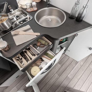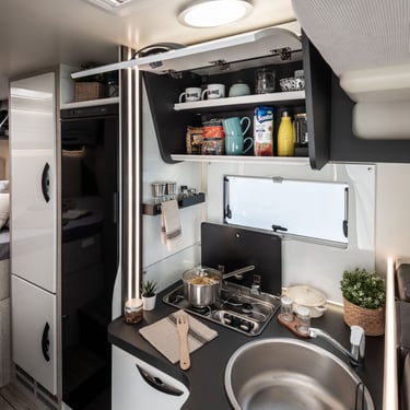 Gătitul este o adevărată plăcere în vehiculele din Seria 300! Zona de gătit cu două arzătoare utilizează optim spațiul, oferind un spațiu amplu de lucru și depozitare în bucătărie pentru pregătirea vaselor sau pentru depozitarea convenabilă a tocătoarelor, recipientelor și a altor accesorii. Efectul Fenix conferă blatului de lucru din bucătărie o eleganță modernă și o durabilitate extraordinară, transformând fiecare experiență culinară într-o plăcere atemporală.