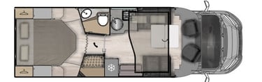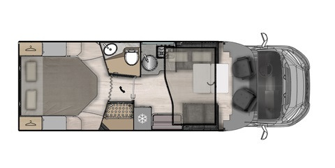 Profil redus, lungime 7,45 m, cu pat central în spate, dinette față în față și baie cu duș separat.
